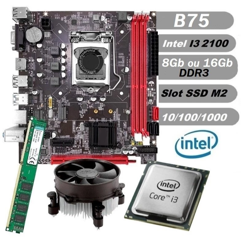 Kit Upgrade i3-2100 com placa H61 M.2, DDR3 8GB ou 16GB e cooler instalado.