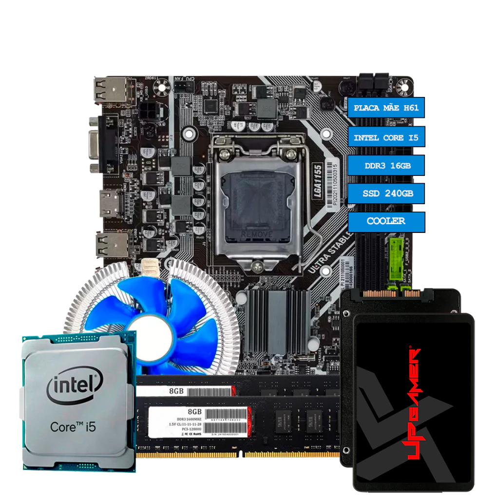 Kit upgrade PC Gamer com processadores Intel Core de terceira geração (i3, i5 ou i7), placa-mãe H61 ou B75, memória DDR3 e opções adicionais de cooler e SSD. Projetado para quem deseja montar ou renovar um PC de forma econômica, eficiente e compatível com workloads de jogos leves, escritório e uso empresarial.
